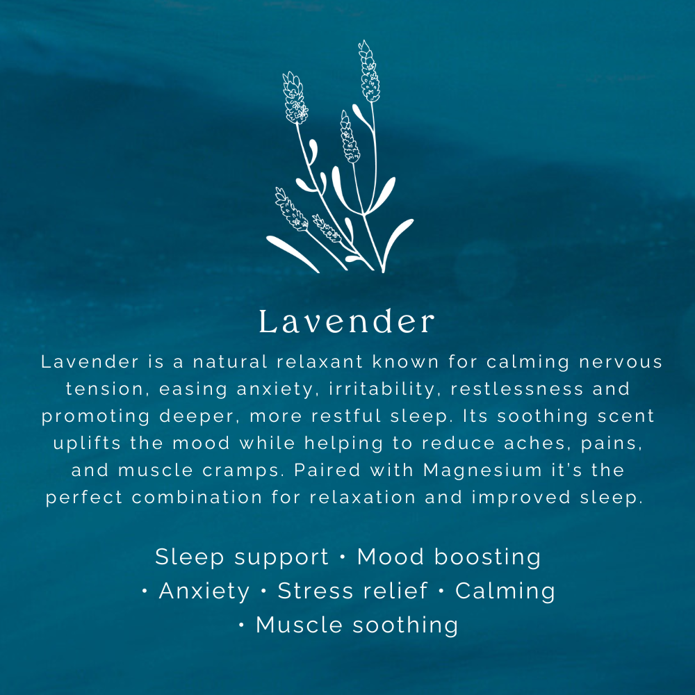 Lavender is a natural relaxant known for calming nervous tension, easing anxiety, irritability, restlessness and promoting deeper, more restful sleep. Its soothing scent uplifts the mood while helping to reduce aches, pains, and muscle cramps. Paired with Magnesium it’s the perfect combination for relaxation and improved sleep.
